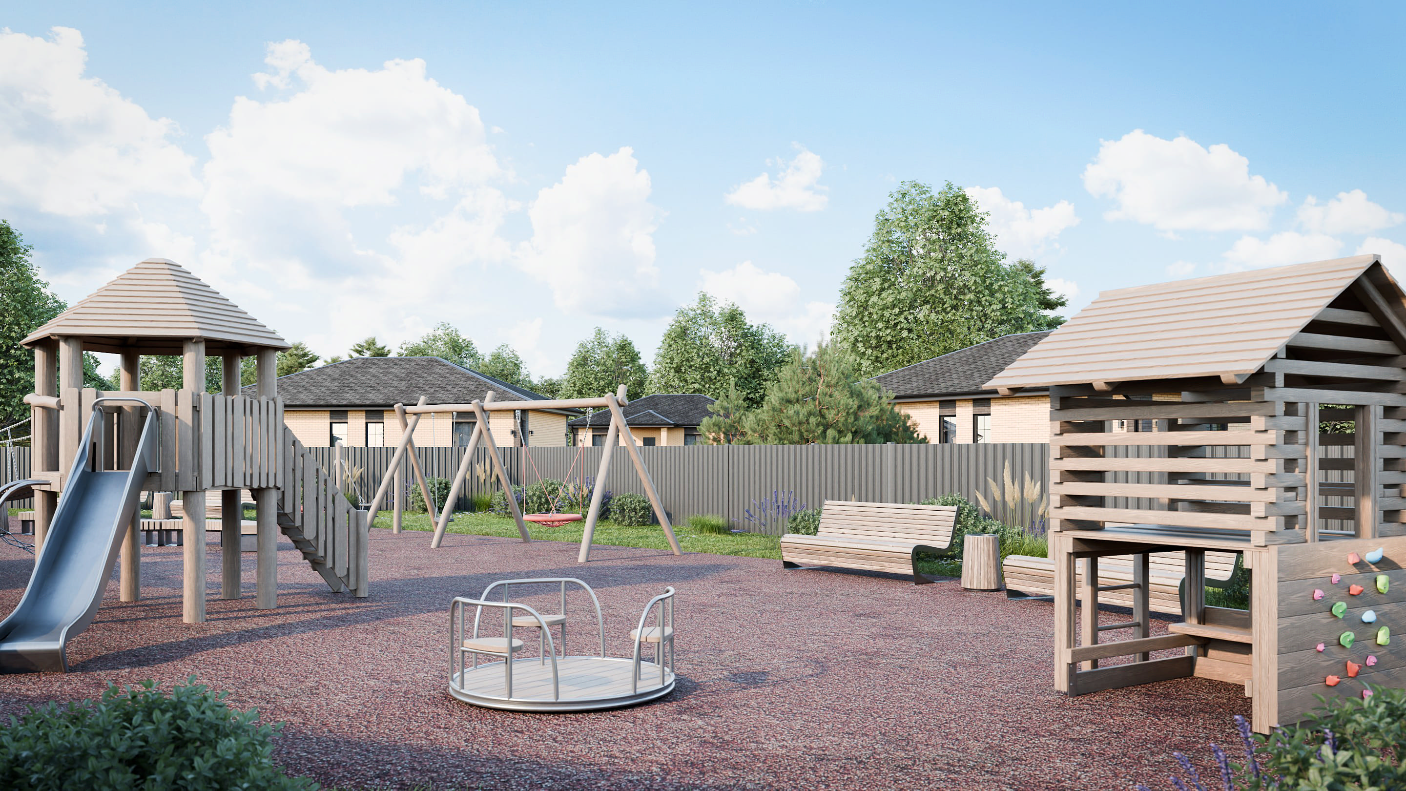Мы создали все условия для вашего удобства: прогулочные аллеи, места для выгула собак, стабильный проводной интернет в каждом доме, электро зарядки для авто, детские площадки, спортивные зоны и многое другое